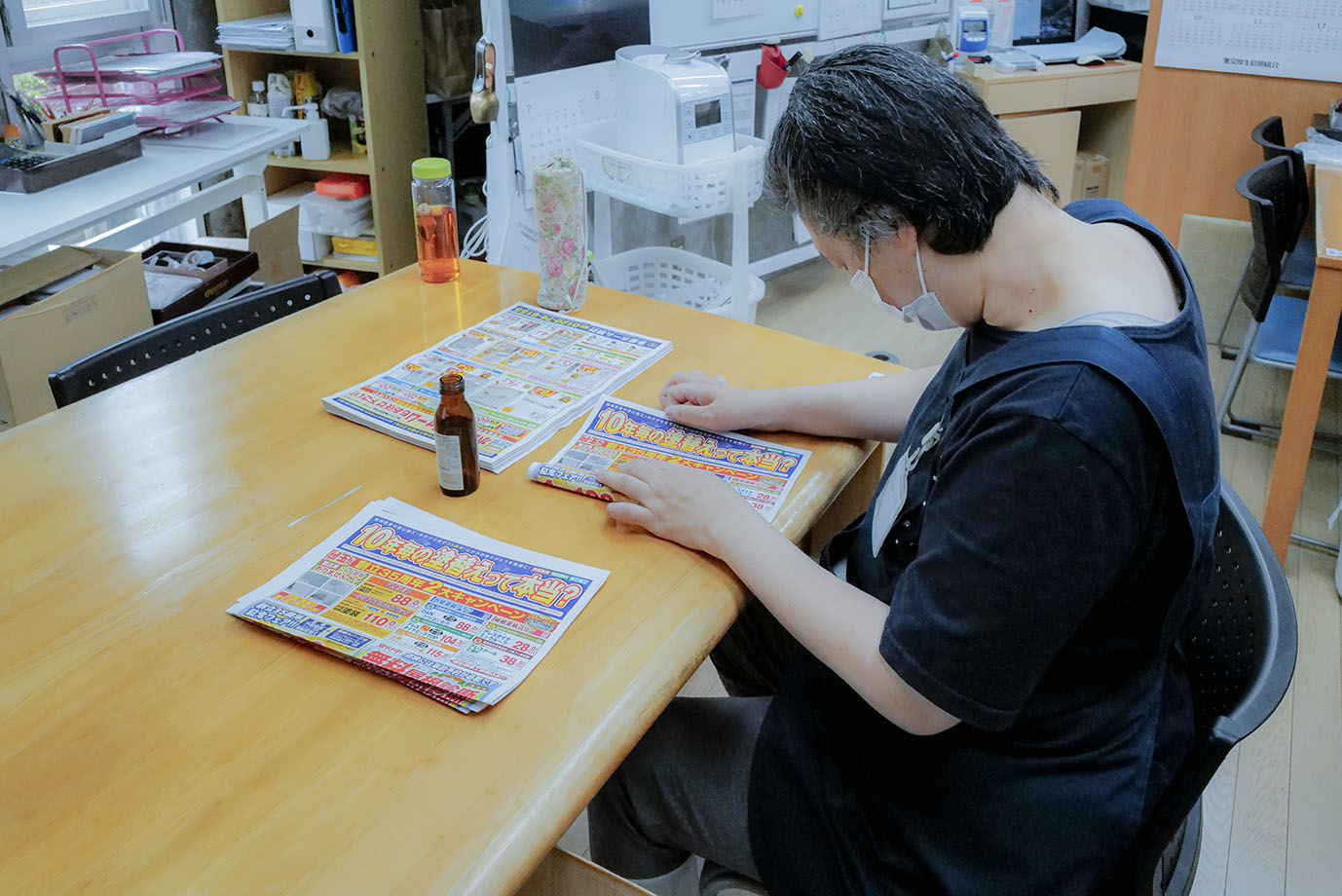 特別養護老人ホームの清掃委託業務、市内パン販売店の委託業務、ネジの組み立て等の内職、委託企業様のポスティング、就労準備学習等です